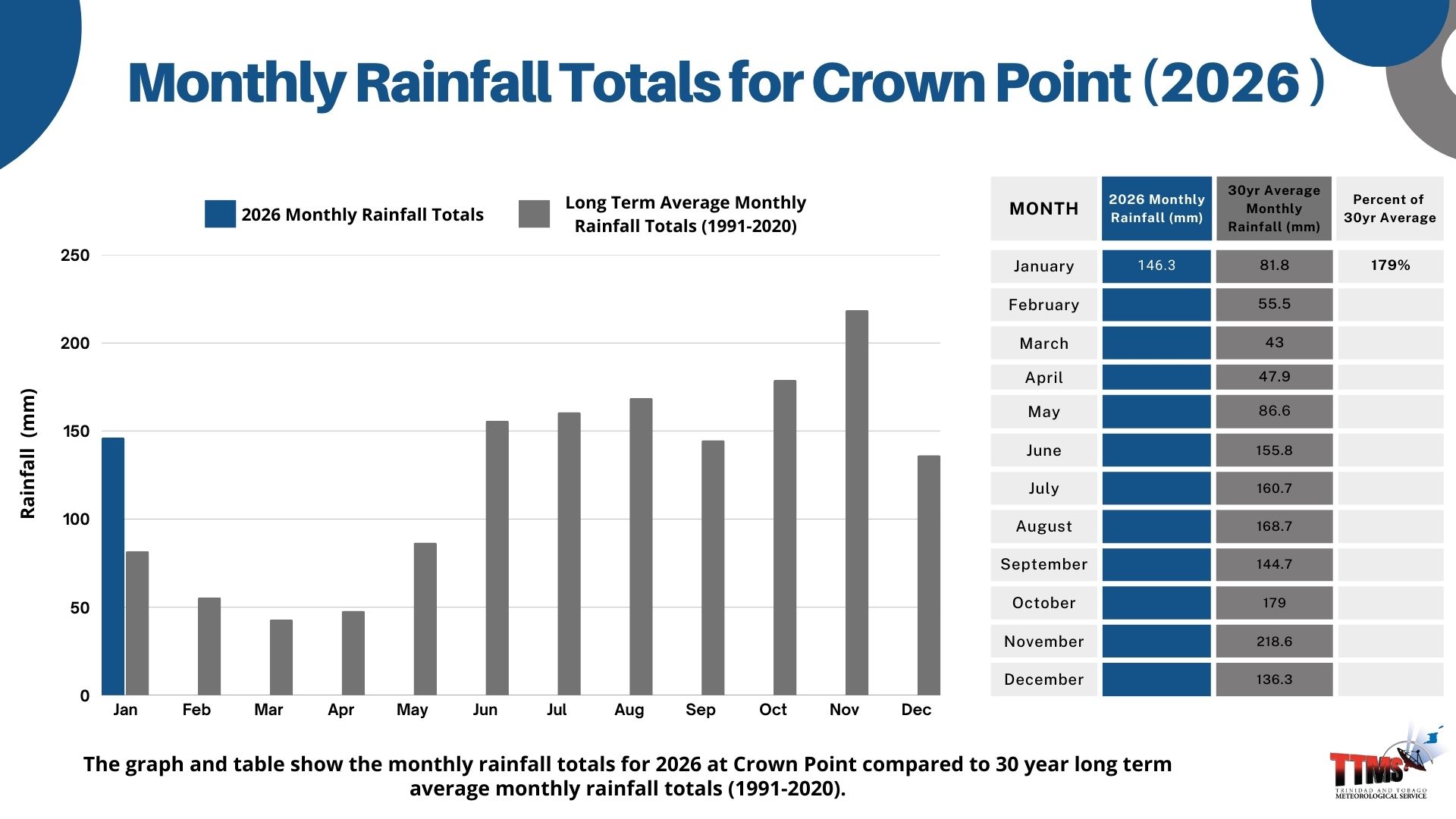 | At Crown Point for the climate reference period 1991-2020 November is the wettest month, with an average monthly rainfall total of 218.6 mm, followed by October with 179.0mm. The month of December is usually the driest month of the wet season, with an average rainfall total of 136.3 mm. March is usually the driest month of the year, with an average of 43.0 mm. | The month of November (2004) with 429.0 mm produced the highest monthly rainfall total on record at Crown Point between 1971 and 2021. Whereas, the month of March (1992) with 2.4 mm produced the lowest monthly rainfall total on record. |