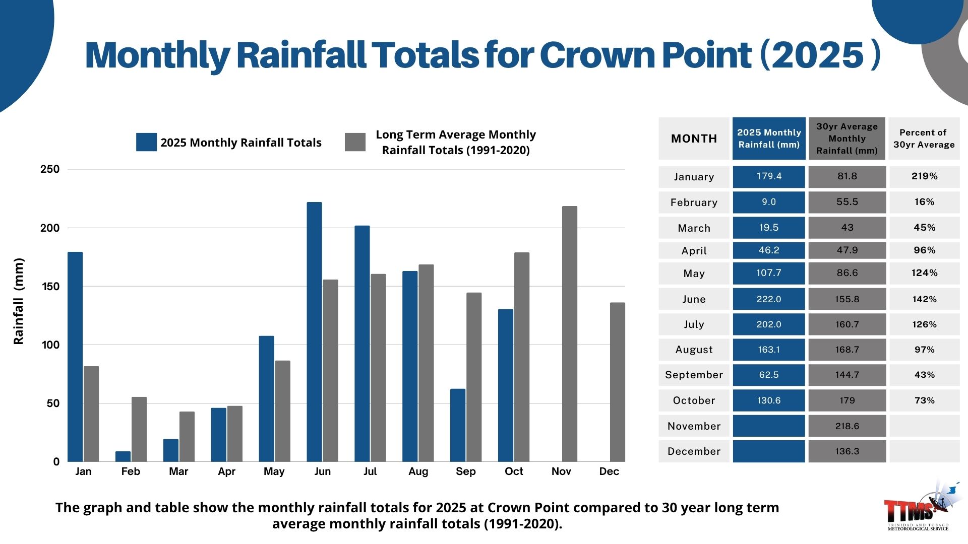 | At Crown Point for the climate reference period 1991-2020 November is the wettest month, with an average monthly rainfall total of 218.6 mm, followed by October with 179.0mm. The month of December is usually the driest month of the wet season, with an average rainfall total of 136.3 mm. March is usually the driest month of the year, with an average of 43.0 mm. | The month of November (2004) with 429.0 mm produced the highest monthly rainfall total on record at Crown Point between 1971 and 2021. Whereas, the month of March (1992) with 2.4 mm produced the lowest monthly rainfall total on record. |